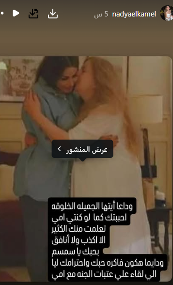 نعت ندى الكامل طليقة الفنان أحمد الفيشاوى ، والدته الفنانة سمية الألفى التي رحلت عن عالمنا منذ أيام، ونشرت ندى صورة تجمعهم عبر خاصية الاستورى على إنستجرام وعلقت قائلة: "وداعا أيتها الجميلة الخلوقة، أحببتك كما لو كنتِ أمى، تعلمت منك الكثير ألا أكذب ولا أنافق، بحبك يا سمسم ودايما هكون فاكرة حبك واحترامك ليا إلى لقاء على عتبات الجنة مع أمي".
