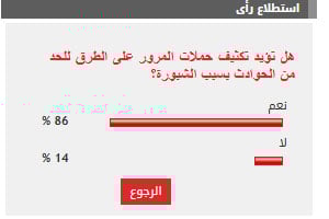 وأيد 86% من القراء مطالب تكثيف حملات المرور على الطرق للحد من الحوادث بسبب الشبورة، بينما عارض 14% من القراء مطالب تكثيف حملات المرور على الطرق للحد من الحوادث بسبب الشبورة.