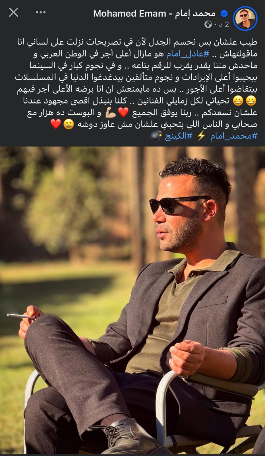 قال الفنان محمد إمام عبر صفحته على موقع فيس بوك: "طيب علشان بس نحسم الجدل لأن في تصريحات نزلت على لساني أنا ماقولتهاش.. عادل امام هو ما زال أعلى أجر في الوطن العربي وما حدش مننا يقدر يقرب للرقم بتاعه.. وفي نجوم كبار في السينما بيجيبوا أعلى الإيرادات ونجوم متألقين بيدغدغوا الدنيا في المسلسلات بيتقاضوا أعلى الأجور.. بس ده ما يمنعش إن أنا برضه الأعلى أجر فيهم تحياتي لكل زمايلي الفنانين.. كلنا بنبذل اقصى مجهود عندنا علشان نسعدكم .. ربنا يوفق الجميع والبوست ده هزار مع صحابي والناس اللي بتحبني علشان مش عاوز دوشه".
