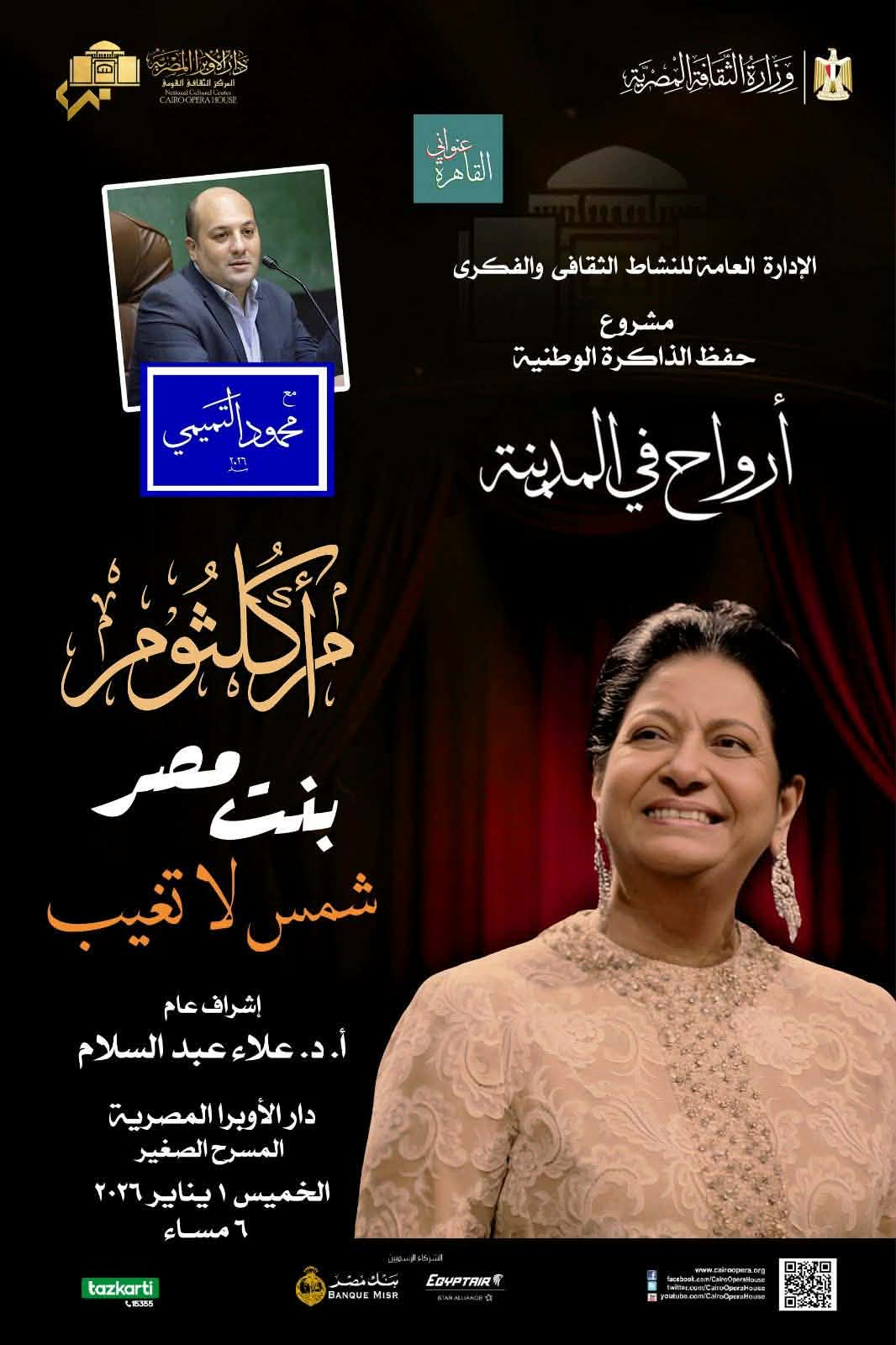 تستهل دار الأوبرا المصرية برئاسة الدكتور علاء عبد السلام العام الجديد 2026 بأمسية من سلسلة أرواح فى المدينة تقديم الكاتب الصحفى محمود التميمى وتحمل عنوان أم كلثوم بنت مصر .. شمس لا تغيب وتأتى ضمن مشروعه الثقافى القاهرة عنوانى وتعقد فى إطار فعاليات النشاط الثقافى والفكرى بإشراف رشا الفقى وذلك فى السادسة مساء الخميس الأول من يناير على المسرح الصغير.