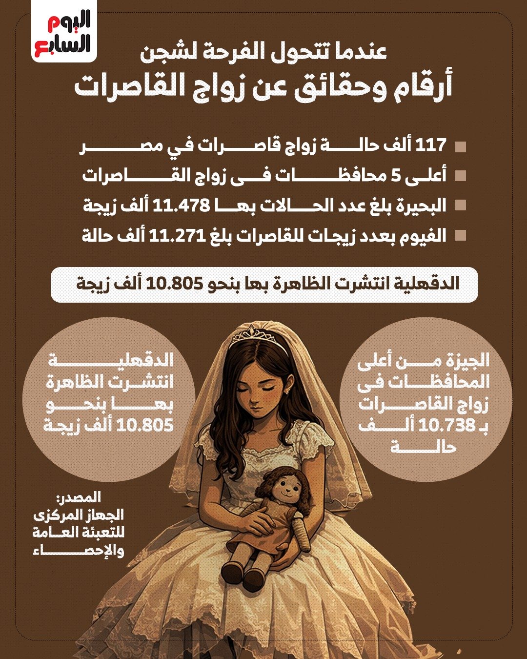 "دنيا" واحدة ضمن آلاف الفتيات اللاتي يتعرضن لزواج القاصرات، الذي بلغت 15% من نسب عقود الزواج وفق أخر احصائيات الجهاز المركزي للتعبئة والإحصاء، بسبب الظروف المعيشية الصعبة، وتزويجهن بالمخالفة لقانون الطفل رقم 126 لسنة 2008، ويعد الباب الخلفي للإتجار للبشر وفق القانون رقم 64 لسنة 2010.
