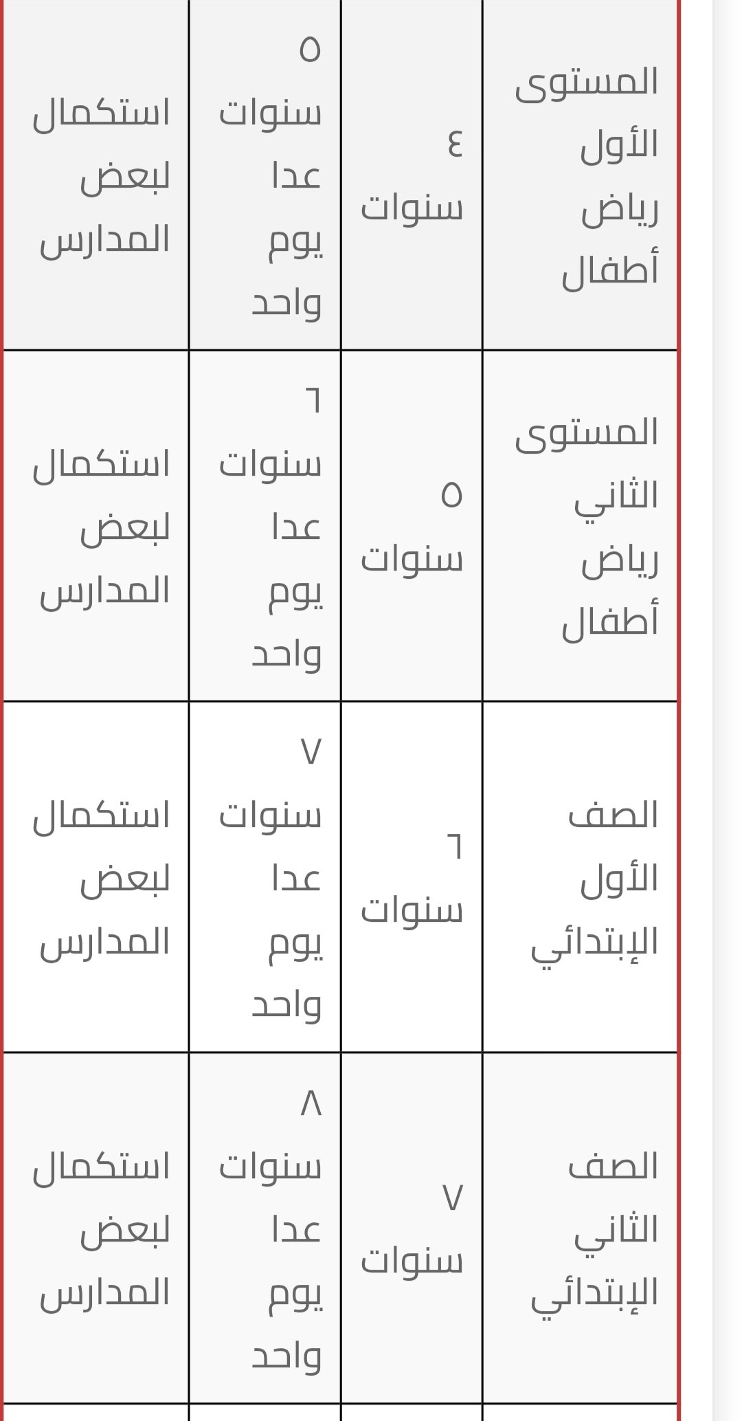 - الصف الأول الابتدائي 6 سنوات حتى 7 سنوات عدا يوم واحد.