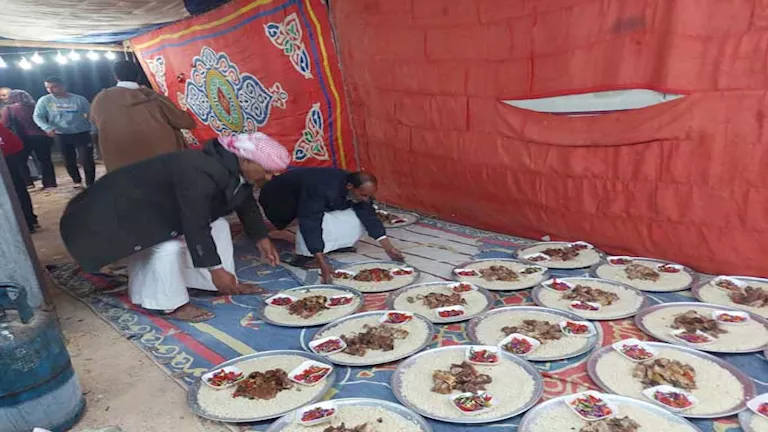 وأضاف "حسان"، أن ولائم الطعام من أهم سمات الأفراح البدوية، فكلما كبرت الوليمة دل ذلك على عزة القبيلة، ويشرف على إعدادها طهاة على دراية بالعادات والتقاليد، حيث تتضمن الوليمة لحوم الضأن والعجول، ويستقبل أهل العريس ضيوفهم بالقهوة العربية المُرّة والشاي بالحبق داخل الفازة، كأولى إشارات الترحيب، تليها الولائم في صوانٍ كبيرة تحتوي على الأرز المطهو بشربة اللحوم، ولحوم الضأن المندي، والعجول المسلوقة، إلى جانب السلطة وخبز الفراشيح.