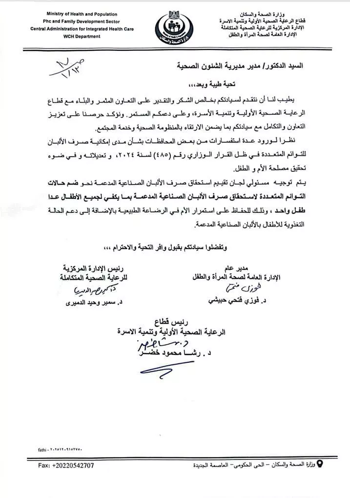 جاء القرار، الصادر عن قطاع الرعاية الصحية الأولية وتنمية الأسرة، ردًا على استفسارات وردت من عدد من المحافظات حول مدى أحقية صرف الألبان الصناعية المدعمة للتوائم، في ظل القرار الوزاري رقم 485 لسنة 2022 وتعديلاته، وما تضمنه من ضوابط تحقق التوازن بين دعم التغذية السليمة للأطفال وتشجيع الرضاعة الطبيعية.