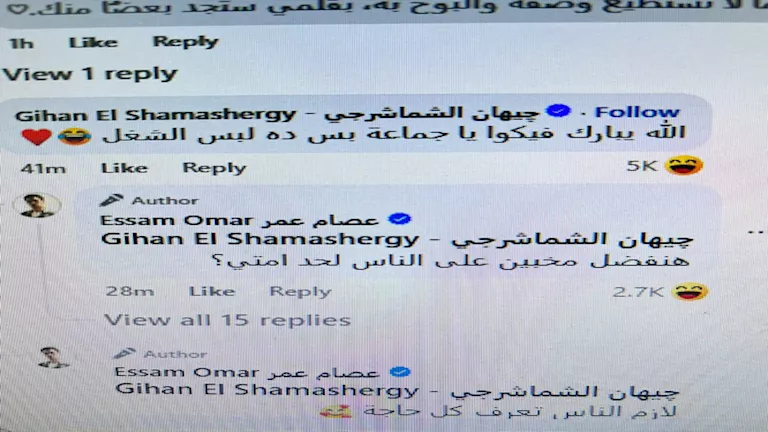 مازح الفنان عصام عمر والفنانة جيهان الشماشرجي الجمهور والمتابعين بطريقة كوميدية، إذ قام عصام عمر بنشر صورة رفقة الفنانة جيهان الشماشرجي عبر حسابه على "فيسبوك" وكتب: "الحمد لله الذي بنعمته تتم الصالحات"، وسط تساؤلات الجمهور حول حقيقة ارتباطهما.