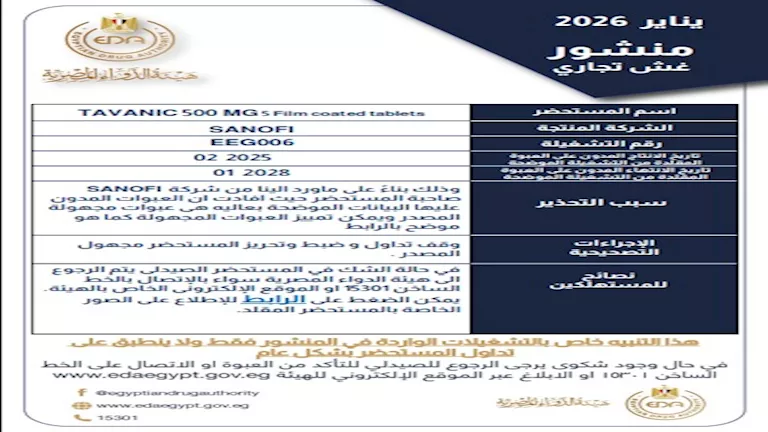 وأصدرت هيئة الدواء تحذيرًا من التشغيلة رقم "EEG006" من دواء "Tavanic 500 mg"، طبقًا لإفادة شركة سانوفي بوجود عبوات مجهولة المصدر من هذا الصنف.