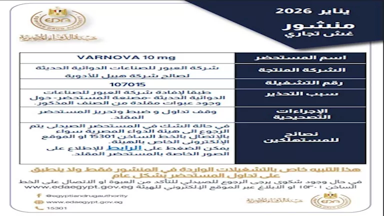 وأصدرت الهيئة منشورًا رقم 4 لسنة 2026، للتحذير من التشغيلة رقم "107015" من مستحضر "VARNOVA 10 mg" الذي تنتجه شركة العبور للصناعات الدوائية لصالح شركة هييل، طبقًا لإفادة الشركة المنتجة بوجود عبوات مقلدة.