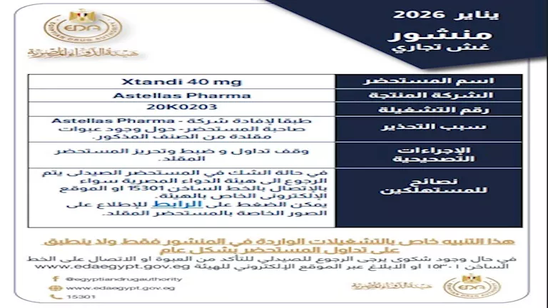 كما حذرت الهيئة، في منشور رقم 3 لسنة 2026، من التشغيلة رقم "20K0203" من دواء "Xtandi 40 mg"، طبقًا لإفادة شركة "Astellas Pharma" صاحبة المستحضر، بوجود عبوات مقلدة من الصنف المذكور.