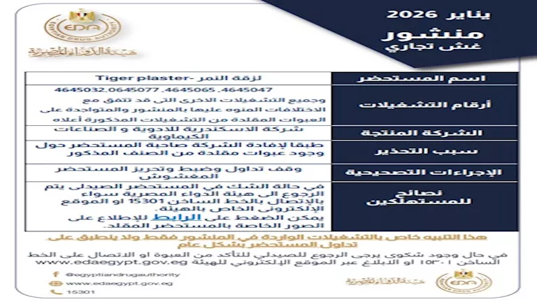 وحذرت هيئة الدواء، في منشور رقم 5 لسنة 2026، من عدة تشغيلات مغشوشة من "لزقة النمر – Tiger Plaster".