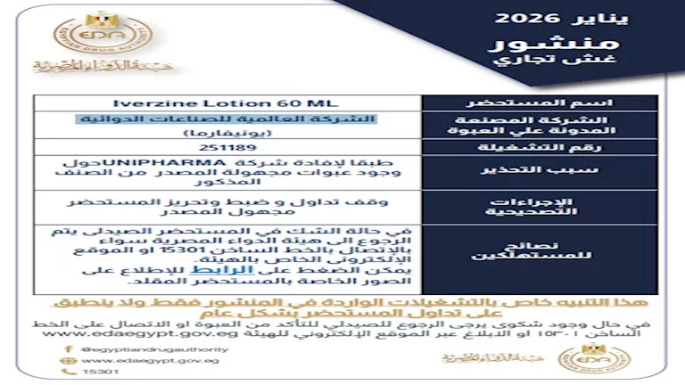 كما حذرت الهيئة من تشغيلة مجهولة المصدر رقم "251189" من مستحضر "Iverzine Lotion 60 ML" الذي تنتجه الشركة العالمية للصناعات الدوائية.