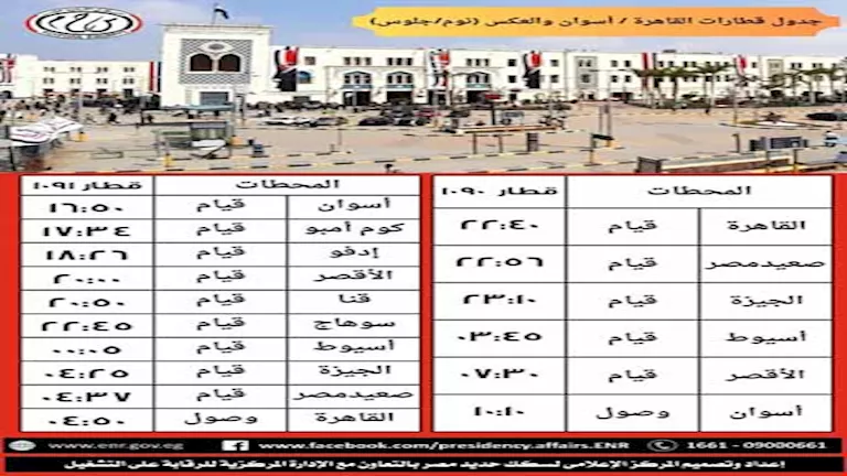وأشارت السكة الحديد، في المقابل، إلى أنه يبدأ تشغيل قطار رقم 1091 من محطة أسوان باتجاه القاهرة، وذلك اعتبارًا من يوم الأحد الموافق 8 فبراير 2026، على النحو الآتي: