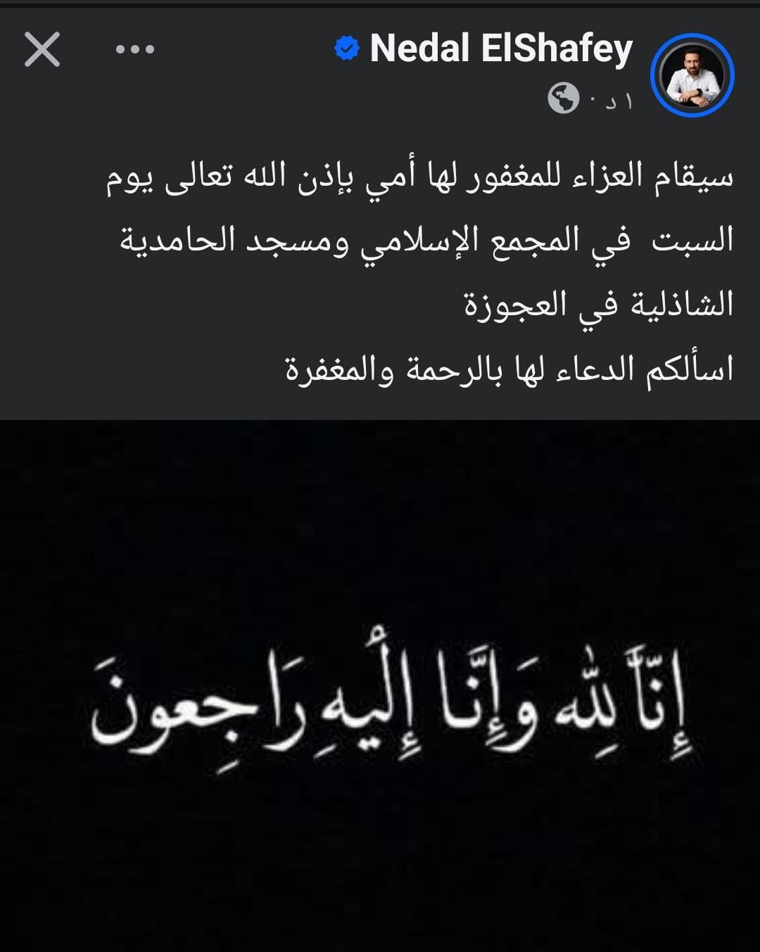 نضال الشافعى يستقبل عزاء والدته السبت المقبل فى الحامدية الشاذلية