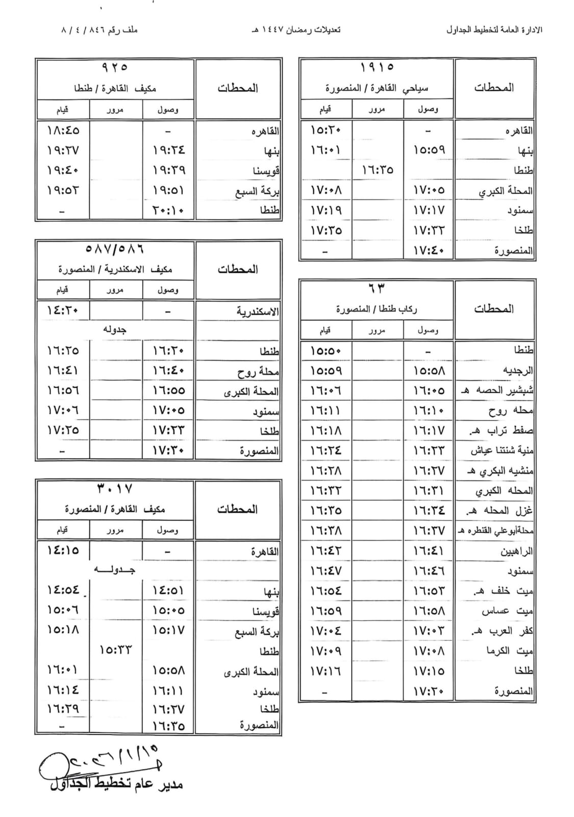 يترتب على هذا التشغيل تعديل مواعيد قطار (586-587) مكيف "الإسكندرية / المنصورة"، وقطار (63) ركاب "طنطا / المنصورة" وفقاً للجداول المرفقة.