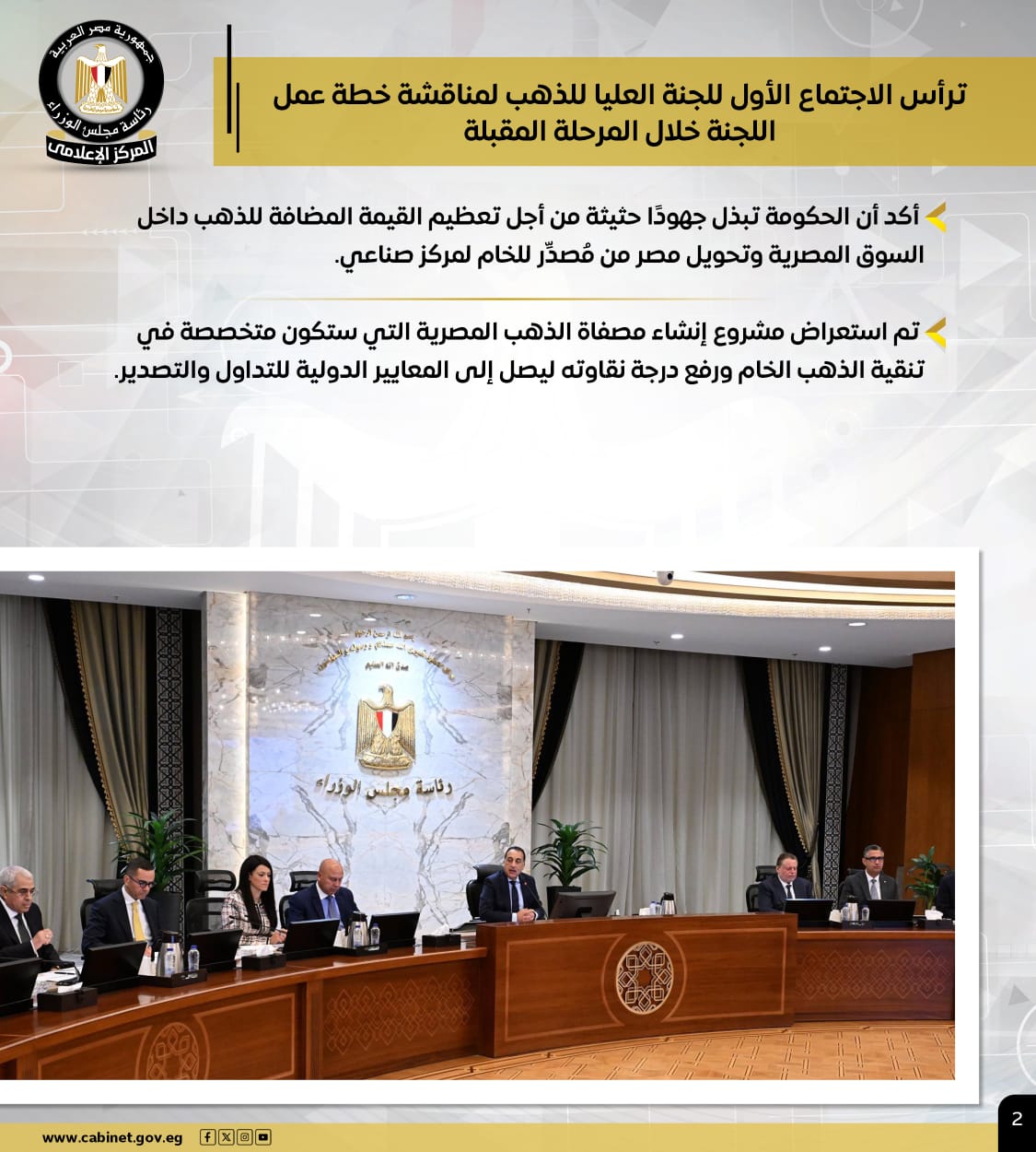 كما ترأس سيادته الاجتماع الأول للجنة العليا للذهب لمناقشة خطة عمل اللجنة خلال المرحلة المقبلة، مؤكدًا جهود الحكومة الحثيثة لتعظيم القيمة المضافة للذهب وتحويل مصر من مُصدِّر للخام إلى مركز صناعي، وتم استعراض مشروع إنشاء مصفاة الذهب المصرية التي ستكون متخصصة في تنقية الذهب الخام ورفع درجة نقاوته للمعايير الدولية للتداول والتصدير.