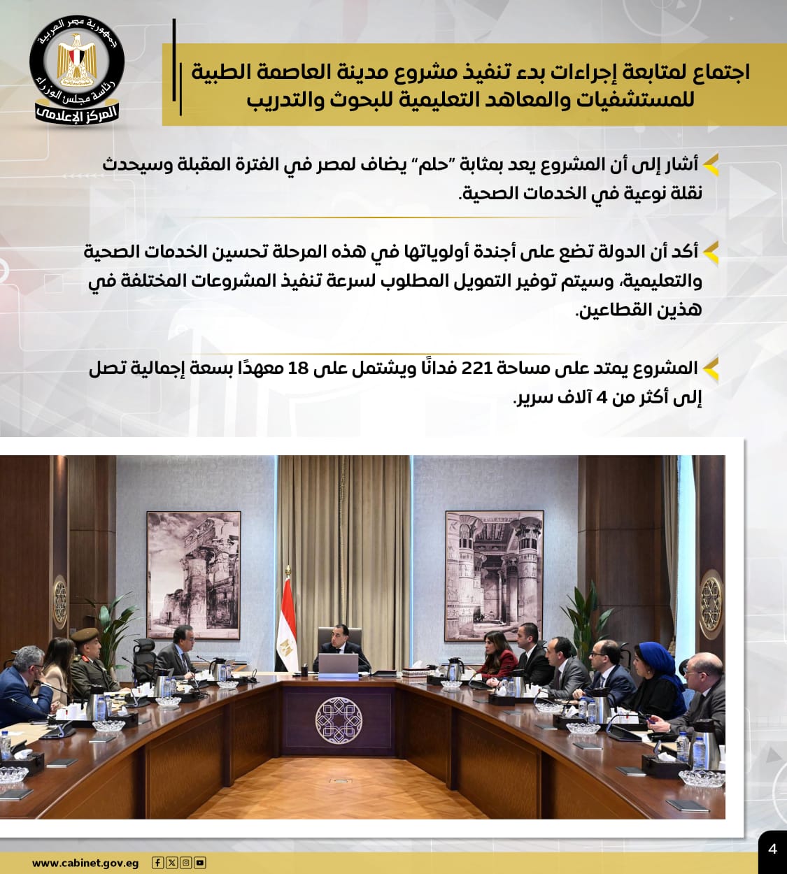 كما عقد رئيس الوزراء اجتماعًا لمتابعة إجراءات بدء تنفيذ مشروع "مدينة العاصمة الطبية للمستشفيات والمعاهد التعليمية للبحوث والتدريب"، حيث أشار إلى أن المشروع يعد بمثابة "حلم" يضاف لمصر في الفترة المقبلة، وسيحدث نقلة نوعية في الخدمات الصحية، وأكد سيادته أن الدولة تضع على أجندة أولوياتها في هذه المرحلة تحسين الخدمات الصحية والتعليمية، مع توفير التمويل المطلوب لسرعة تنفيذ المشروعات المختلفة في هذين القطاعين.