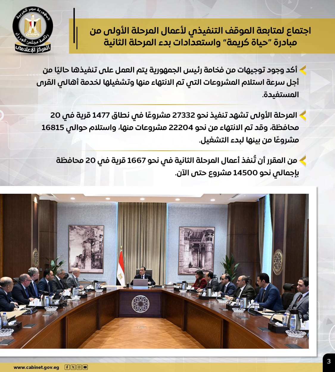 وخلال الاجتماع تمت الإشارة إلى أن المرحلة الأولى تشهد تنفيذ نحو 27332 مشروعًا في نطاق 1477 قرية في 20 محافظة، وتم الانتهاء من نحو 22204 مشروعات منها، واستلام حوالي 16815 مشروعًا لبدء التشغيل، ومن المقرر تنفيذ المرحلة الثانية في نحو 1667 قرية في 20 محافظة بإجمالي نحو 14500 مشروع حتى الآن.