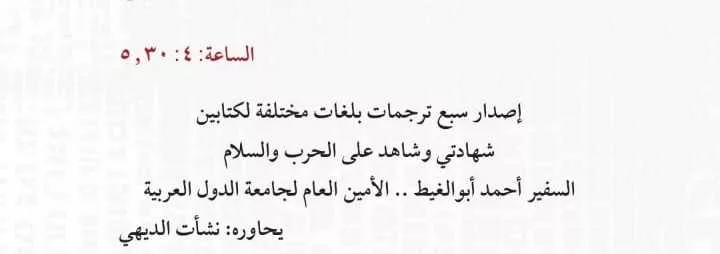 وأوضحت الخطة البرامجية لمعرض الكتاب أنه من المقرر أن تسلط الفاعلية الضوءَ على أهمية ترجمة الكتابَين، لما يتضمنانه من توثيق لتجربة سياسية ودبلوماسية بارزة، تتصل بقضايا الحرب والسلام في المنطقة العربية، وما شهدته من تحولات إقليمية ودولية.