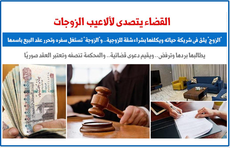 القضاء يتصدى لألاعيب الزوجات.. "الزوج" يثق فى زوجته ويكلفها بشراء شقة للزوجية.. و"الزوجة" تستغل سفره وتحرر عقد البيع باسمها.. ويطالبها بردها وترفض.. ويقيم دعوى قضائية.. والمحكمة تنصفه وتعتبر العقد صوريا