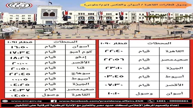 ويُذكر أن الهيئة أعلنت تشغيل عدد 2 قطار بعربات (نوم/ Premium) اعتبارًا من يوم السبت الموافق 7/ 2/ 2026، حيث تقرر تشغيل قطار 1090 بعربات مختلطة (نوم / VIP PREMIUM ) من القاهرة إلى أسوان، على أن يعمل أيام السبت والإثنين والأربعاء من كل أسبوع يقوم من محطة القاهرة الساعة 22.40 يصل لمحطة أسوان الساعة 10.10 صباح اليوم التالي، اعتبارًا من يوم الأحد 8/ 2/ 2026 تشغيل قطار 1091 بعربات مختلطة (نوم / VIP PREMIUM ) من أسوان إلى القاهرة على أن يعمل أيام الأحد والثلاثاء والخميس من كل أسبوع ويقوم من محطة أسوان الساعة 16.50 يصل لمحطة القاهرة الساعة 04.50 صباح اليوم التالي طبقًا للجداول المرفقة .