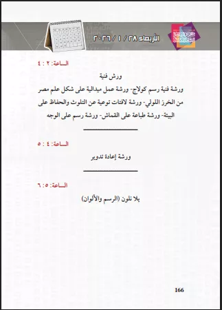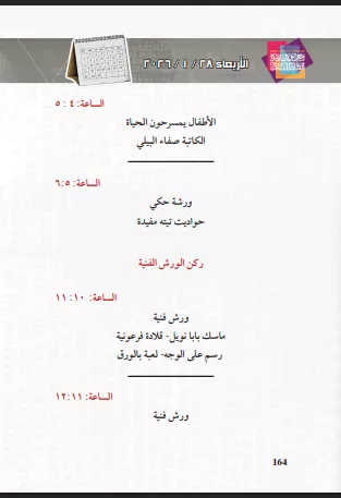 وأوضحت "الهيئة"، أن برنامج ركن الفنون القولية - نشاط الطفل ينطلق في تمام الساعة 11 صباحًا حتى 12 ظهرًا، يعقبه برنامج “مهنتي” من 12 إلى 1 ظهرًا، ثم ورشة مجلة نور من 1 إلى 2 ظهرًا.
