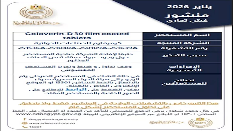وحذّرت الهيئة من عدد من التشغيلات لدواء "Coloverin-D 30 film coated tablets"، الذي تنتجه شركة كيميفارم للصناعات الدوائية، وذلك طبقًا لإفادة الشركة بوجود عبوات مقلدة من الصنف المذكور.