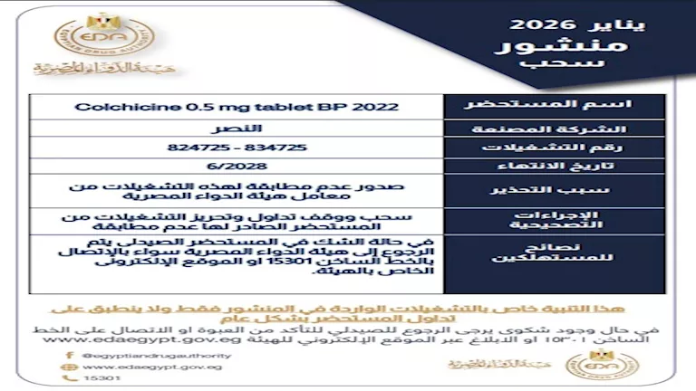 كما أصدرت الهيئة منشورًا رسميًا آخر حذّرت فيه من تشغيلتين لدواء "Colchicine 0.5 mg tablet BP 2022"، الذي تنتجه شركة النصر، وهما: 824725 – 834725.