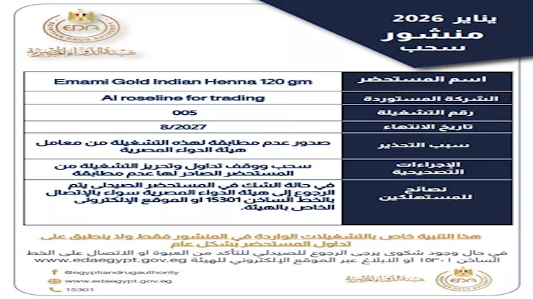 وفي سياق متصل، نشرت هيئة الدواء المصرية تحذيرًا بشأن منتج حناء باسم "Emami Gold Indian Henna 120 gm"، للتشغيلة رقم 005، وذلك لصدور عدم مطابقة لهذه التشغيلة من معامل الهيئة.