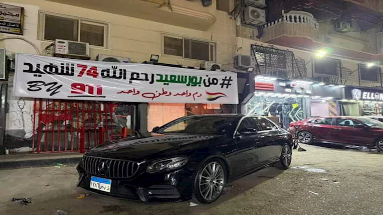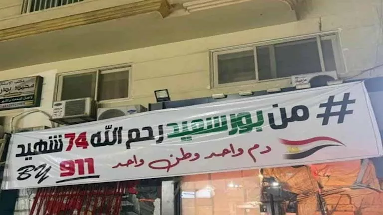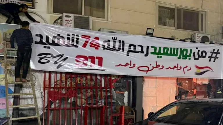 وكُتب على اللافتة عبارات: "من بورسعيد رحم الله 74 شهيد - دم واحد وطن واحد" والتي تم وضعها بشوارع بورسعيد لإحياء ذكرى شهداء أحداث الاستاد الشهيرة.