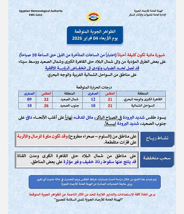 أعلنت الهيئة العامة للأرصاد الجوية، اليوم الثلاثاء، عن تفاصيل الظواهر الجوية المتوقعة غدًا الأربعاء 4 فبراير 2026، محذرة من شبورة مائية قد تكون كثيفة أحيانًا على عدد من الطرق، ما يؤثر على مستوى الرؤية الأفقية.