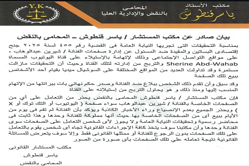 أصدر مكتب المستشار ياسر قنطوش، المحامى بالنقض، بيانًا رسميًا بشأن التحقيقات التى تجريها النيابة العامة فى القضية رقم 455 لسنة 2025 جنح اقتصادى البساتين، والمقيدة ضد المسؤول عن إدارة صفحات الفنانة شيرين عبد الوهاب على مواقع التواصل الاجتماعى.