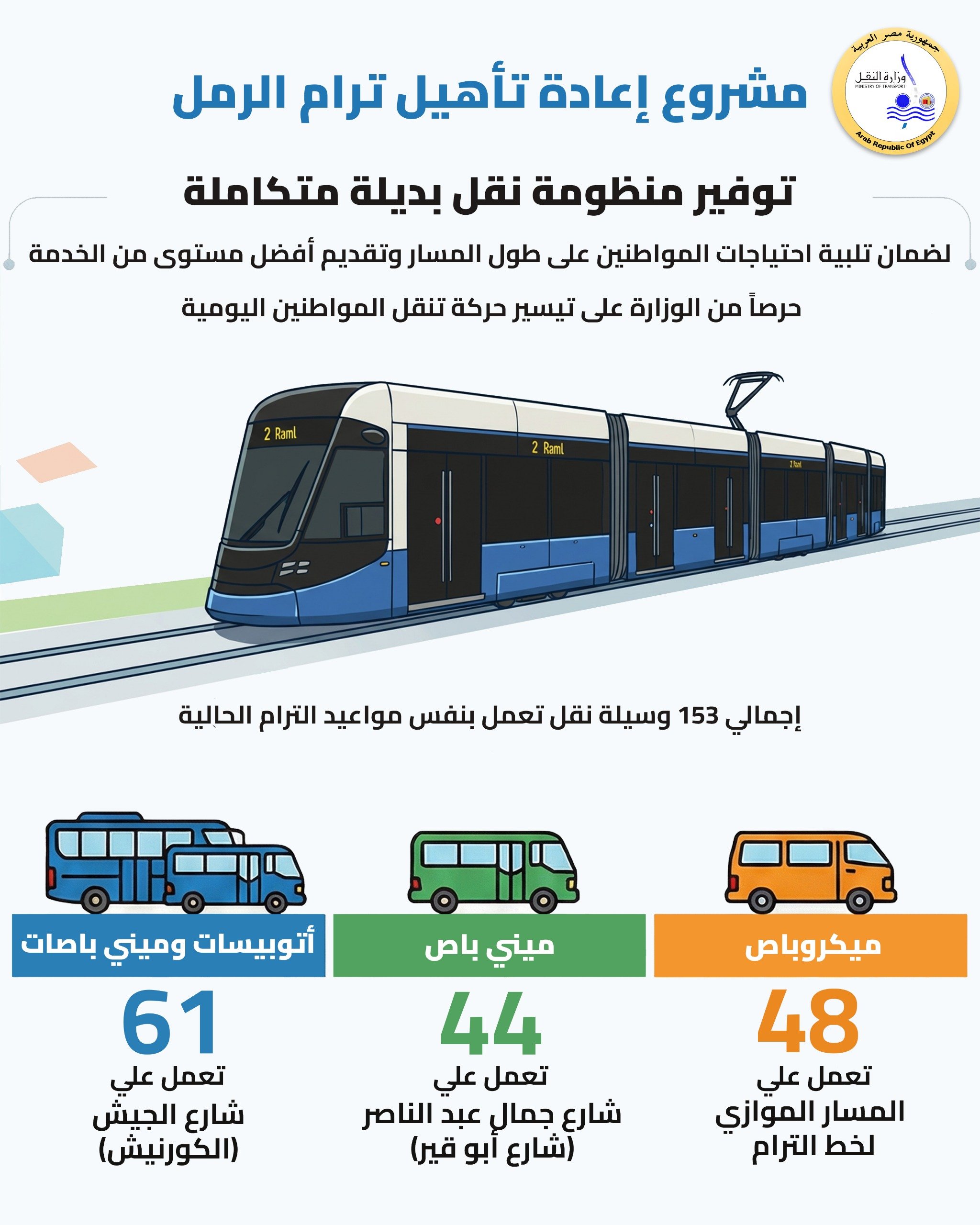 بدأت وزارة النقل تنفيذ مشروع إعادة تأهيل " ترام الرمل " لتحويله لوسيلة نقل أخضر ذكي. يهدف المشروع إلى حل أزمات الإسكندرية المرورية عبر: