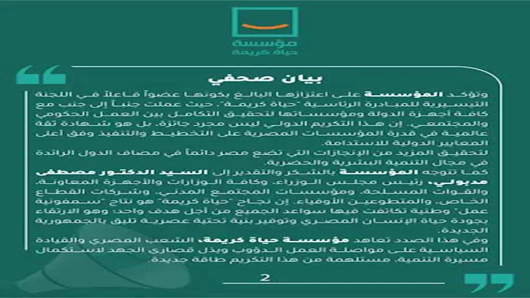 وتوجهت المؤسسة بالشكر والتقدير إلى الدكتور مصطفى مدبولي، رئيس مجلس الوزراء، وكافة الوزارات والأجهزة المعاونة والقوات المسلحة، ومؤسسات المجتمع المدني، وشركات القطاع الخاص، والمتطوعين الأوفياء، مؤكدة أن نجاح "حياة كريمة" هو نتاج سمفونية عمل وطنية تكاتفت فيها سواعد الجميع من أجل هدف واحد، وهو الارتقاء بجودة حياة الإنسان المصري وتوفير بنية تحتية عصرية تليق بالجمهورية الجديدة.