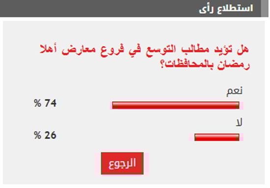 وأيد 74% من القراء مطالب التوسع في فروع معارض أهلا رمضان بالمحافظات، بينما عارض 26% من القراء مطالب التوسع في فروع معارض أهلا رمضان بالمحافظات.