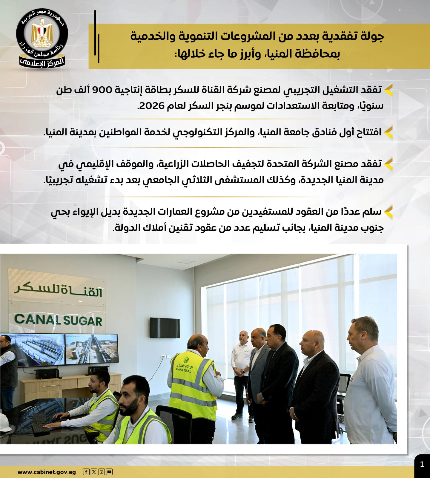 وتضمنت الأنشطة، جولة تفقدية أجراها رئيس الوزراء، بعدد من المشروعات التنموية والخدمية بمحافظة المنيا، حيث تفقد سيادته التشغيل التجريبي لمصنع شركة القناة للسكر بطاقة إنتاجية 900 ألف طن سنويًا، ومتابعة الاستعدادات لموسم بنجر السكر لعام 2026، كما افتتح أول فنادق جامعة المنيا، والمركز التكنولوجي لخدمة المواطنين بمدينة المنيا.