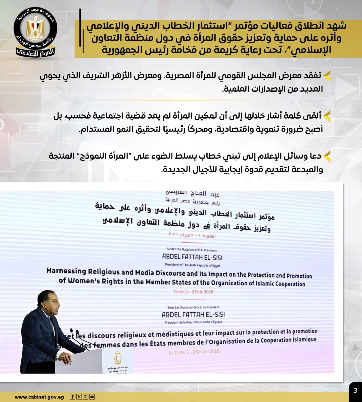وشهد رئيس الوزراء انطلاق فعاليات مؤتمر "استثمار الخطاب الديني والإعلامي وأثره على حماية وتعزيز حقوق المرأة في دول منظمة التعاون الإسلامي"، تحت رعاية كريمة من فخامة رئيس الجمهورية، حيث تفقد معرض المجلس القومي للمرأة المصرية، ومعرض الأزهر الشريف الذي يحوي العديد من الإصدارات العلمية.