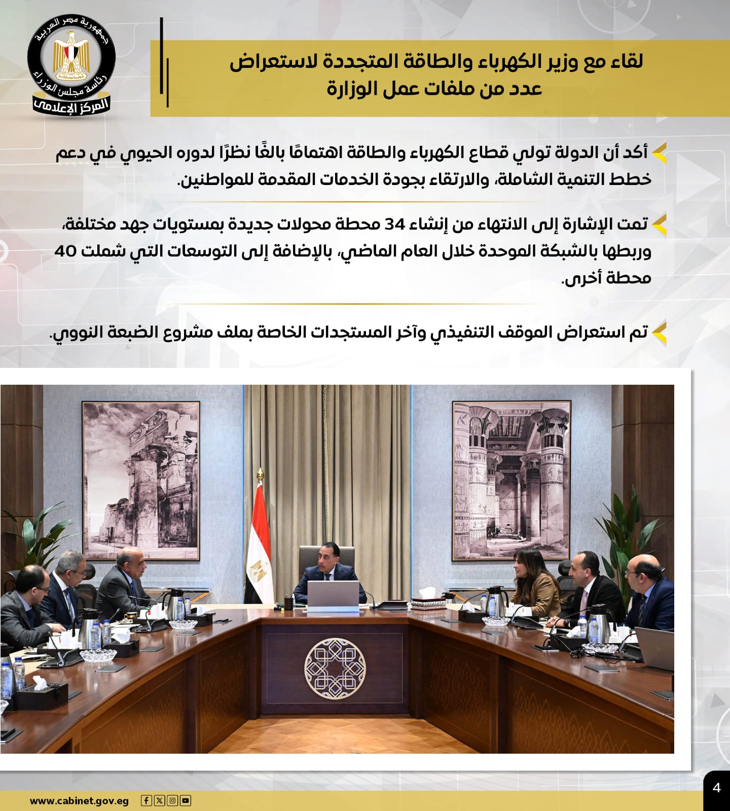 وشملت الأنشطة، لقاء مع وزير الكهرباء والطاقة المتجددة لاستعراض عدد من ملفات عمل الوزارة، مؤكدًا أن الدولة تولي قطاع الكهرباء والطاقة اهتمامًا بالغًا نظرًا لدوره الحيوي في دعم خطط التنمية الشاملة، وتمت الإشارة إلى الانتهاء من إنشاء 34 محطة محولات جديدة بمستويات جهد مختلفة، وربطها بالشبكة الموحدة خلال العام الماضي، بالإضافة إلى التوسعات التي شملت 40 محطة أخرى، كما تم استعراض الموقف التنفيذي وآخر مستجدات ملف مشروع الضبعة النووي.