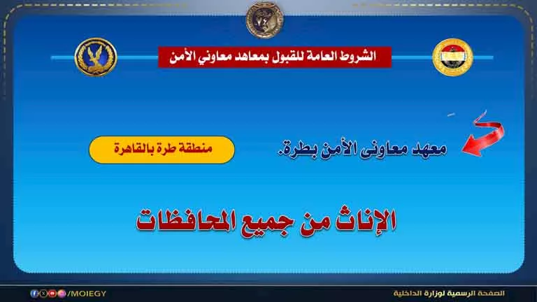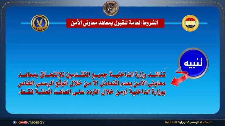 وأكدت وزارة الداخلية ضرورة استيفاء المتقدمين للاشتراطات الصحية والبدنية التي يحددها المجلس الطبي المتخصص بهيئة الشرطة، إلى جانب اجتياز اختبارات اللياقة البدنية واختبارات السمات، وفقًا للقرار الوزاري المنظم للائحة الداخلية لمعاهد معاوني الأمن، على ألا يقل طول المتقدم عن 168 سم.