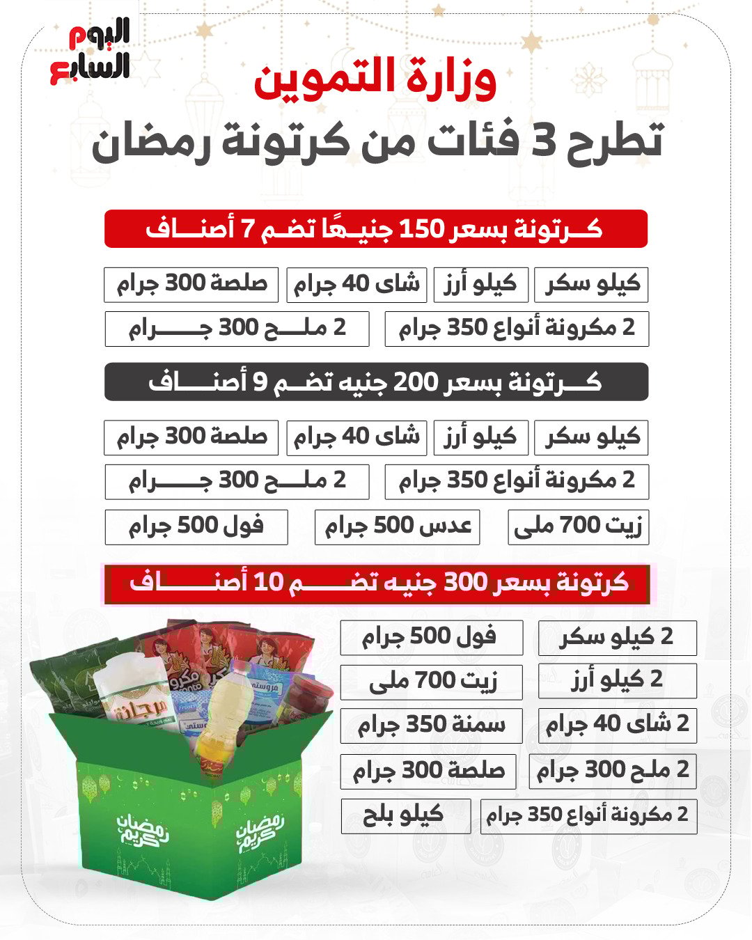 توفر وزارة التموين والتجارة الداخلية ممثلة فى الشركات التابعة 3 أنواع من كرتونة رمضان بأسعار مناسبة للمواطنين، إضافة إلى طرح 33 صنف ياميش.
