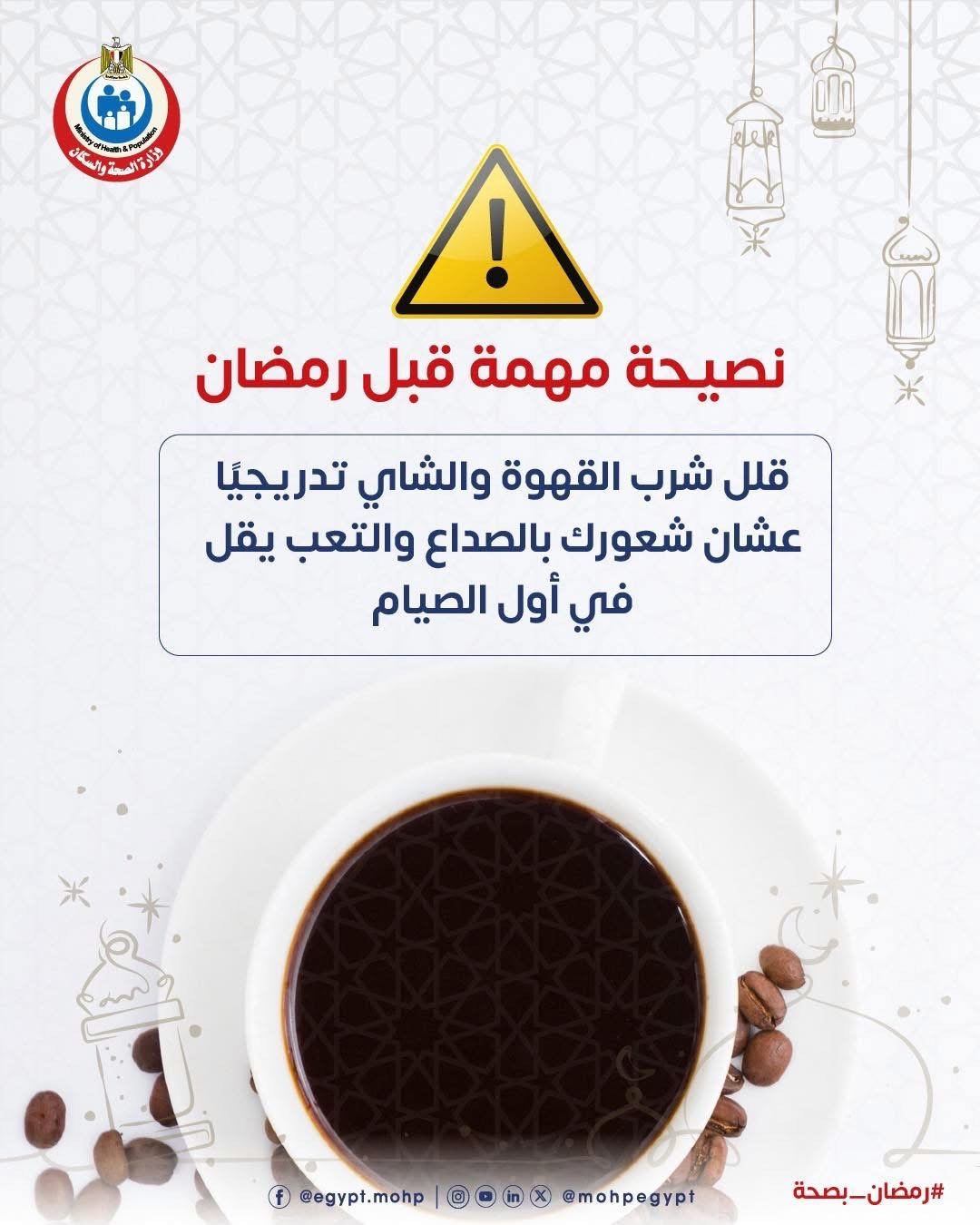 قدمت وزارة الصحة والسكان نصيحة هامة للمواطنين مع اقتراب شهر رمضان المبارك، مشددة على أهمية تقليل استهلاك القهوة والشاي بشكل تدريجي قبل بدء الصيام، لتقليل الشعور بالصداع والتعب خلال الأيام الأولى من الشهر الكريم.