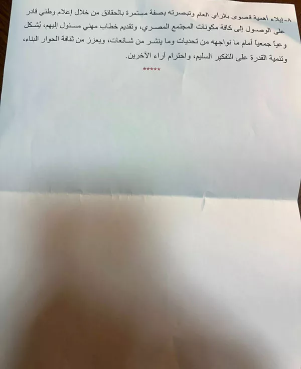 * إيلاء أهمية قصوى بالرأي العام وتبصرته بصفة مستمرة بالحقائق من خلال إعلام وطني قادر على الوصول إلى كافة مكونات المجتمع المصري، وتقديم خطاب مهني مسؤول إليهم، يُشكل وعيا جمعيًا أمام ما نواجهه من تحديات وما ينشر من شائعات، ويعزز من ثقافة الحوار البناء وتنمية القدرة على التفكير السليم، واحترام آراء الآخرين.