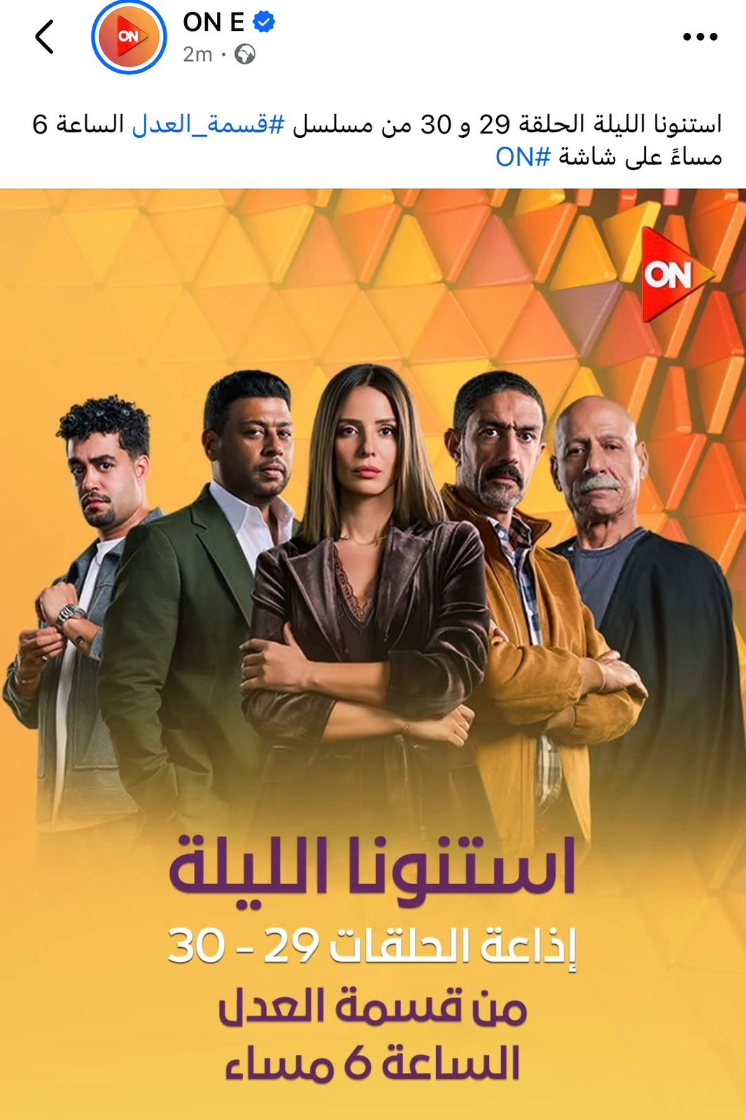 أعلنت قناة on عرض آخر حلقتين من مسلسل قسمة العدل اليوم الساعة 6 مساء، وكان يعرض المسلسل يوميا في تمام الساعة 07:30 مساء.