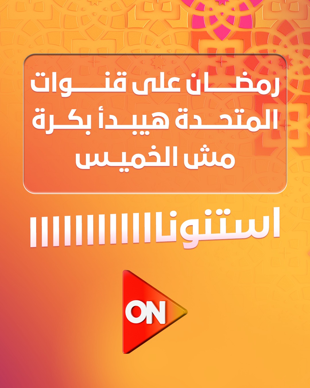 أعلنت الصفحة الرسمية لقناة ON عن بدء عرض مسلسلاتها بداية من غد الأربعاء، حيث نشرت عبر صفحاتها الرسمية بمختلف منصات السوشيال ميديا، صورة لزيادة حماس متابعيها، وكتبت: رمضان على قنوات المتحدة هيبدأ بكرة، مش الخميس، استنونا.