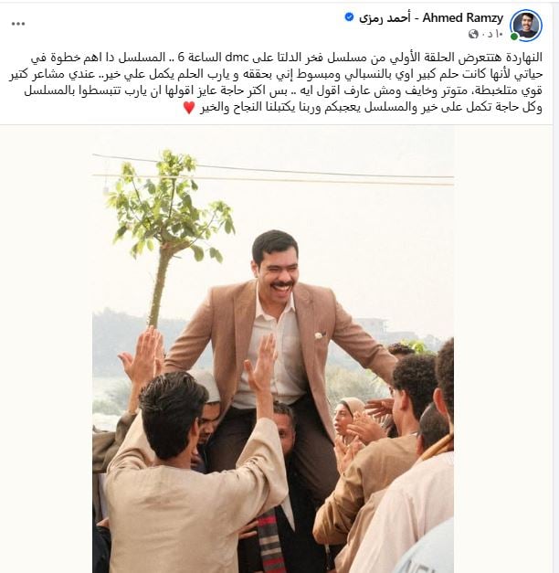 وعبر أحمد رمزي عن سعادته الكبيرة بعرض العمل، مؤكدًا أن المسلسل يُعد أهم خطوة في حياته الفنية، قائلًا إن بطولة فخر الدلتا كانت حلمًا كبيرًا بالنسبة له، وكان يتمنى تحقيقه منذ فترة طويلة، وهو ما يجعله يشعر بالفخر والسعادة مع اقتراب عرضه على الجمهور.