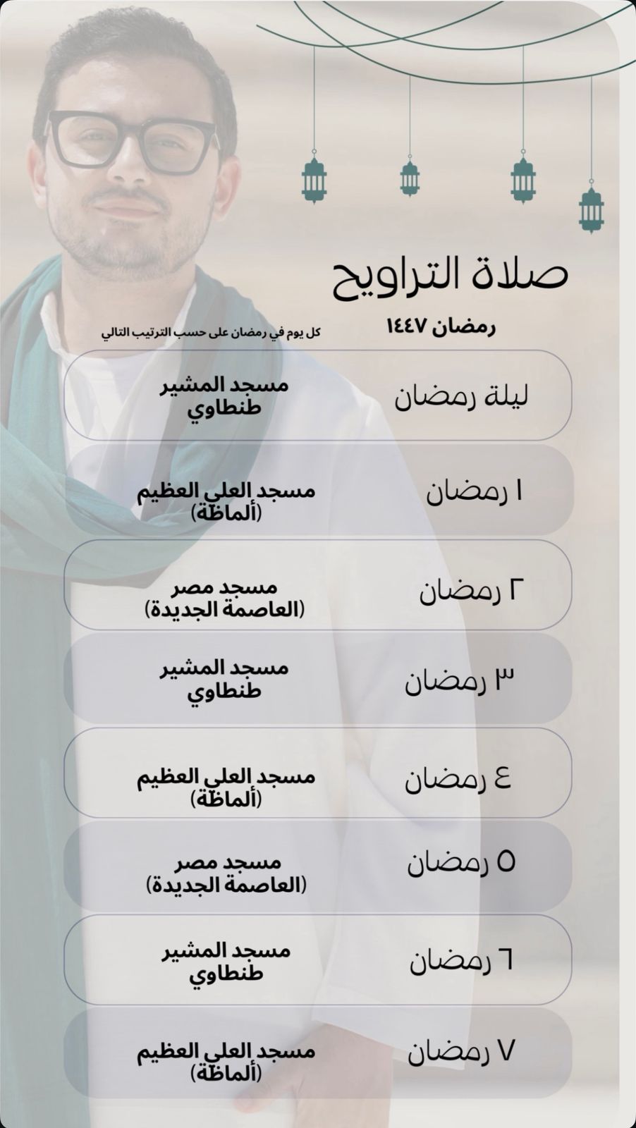 وأوضح أمين أن هذا الظرف الصحي الطارئ حال دون التزام الشيخ مصطفي عاطف بالجدول المعد له مسبقاً خلال الأيام الأولى من شهر رمضان، والذي كان يتضمن إقامة صلاة التراويح في كل من مسجد العلي العظيم، ومسجد المشير طنطاوى، بالإضافة إلى عدد من المساجد الأخرى.