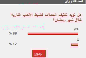 وأيد 88% من القراء مطالب تكثيف الحملات لضبط الألعاب النارية خلال شهر رمضان، بينما عارض 12% من القراء مطالب تكثيف الحملات لضبط الألعاب النارية خلال شهر رمضان.