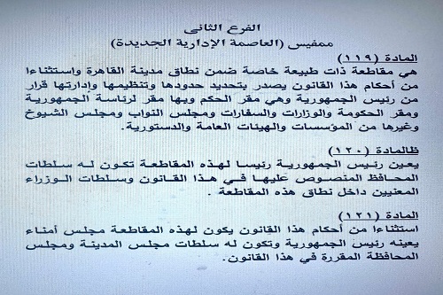 وبحسب المادة ١١٩ منه يقترح المشروع أن تكون ممفيس (العاصمة الإدارية الجديدة) مقاطعة ذات طبيعة خاصة ضمن نطاق مدينة القاهرة، لها وضع استثنائي، يصدر بتحديد حدودها وتنظيمها وإدارتها قرار من رئيس الجمهورية.