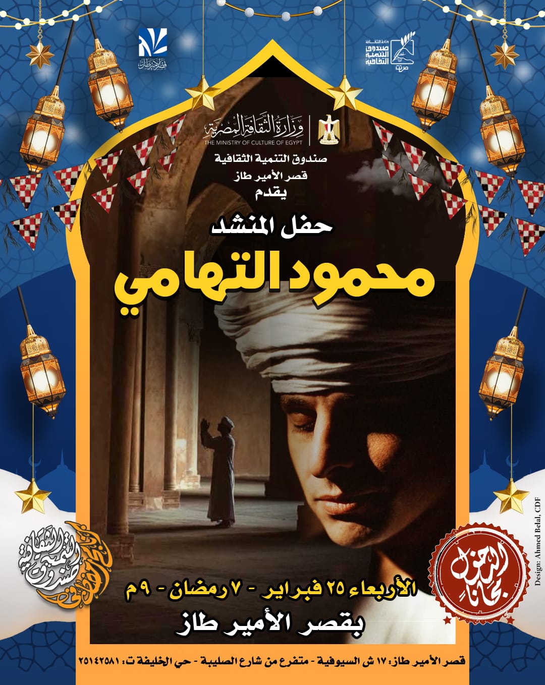 ضمن برنامج ليالي رمضان الثقافية والفنية الذي ينظمه صندوق التنمية الثقافية ، يستضيف قصر الأمير طاز حفلًا للمنشد محمود التهامي، أحد أبرز نجوم البرنامج الرمضاني لهذا العام، وذلك مساء الأربعاء 25 فبراير، الموافق 7 رمضان، في تمام الساعة التاسعة مساءً، بمقر القصر بحي الخليفة.