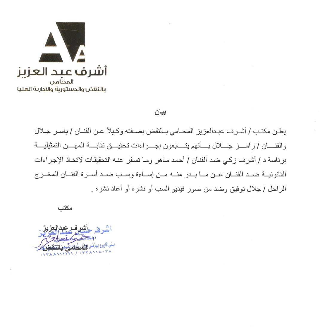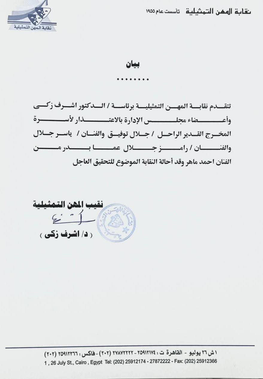وأصدرت نقابة المهن التمثيلية بياناً جاء فيه: "تتقدم نقابة المهن التمثيلية برئاسة الدكتور أشرف زكى وأعضاء مجلس الإدارة بالاعتذار لأسرة المخرج القدير الراحل جلال توفيق والفنان ياسر جلال والفنان رامز جلال، عما بدر من الفنان أحمد ماهر، وقد أحالت النقابة الموضوع للتحقيق العاجل".