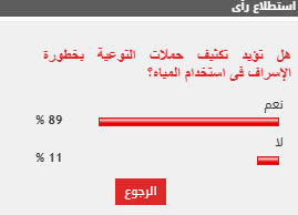 وأيد 89% من القراء مطالب تكثيف حملات التوعية بخطورة الإسراف فى استخدام المياه، بينما عارض 11% من القراء مطالب تكثيف حملات التوعية بخطورة الإسراف فى استخدام المياه.
