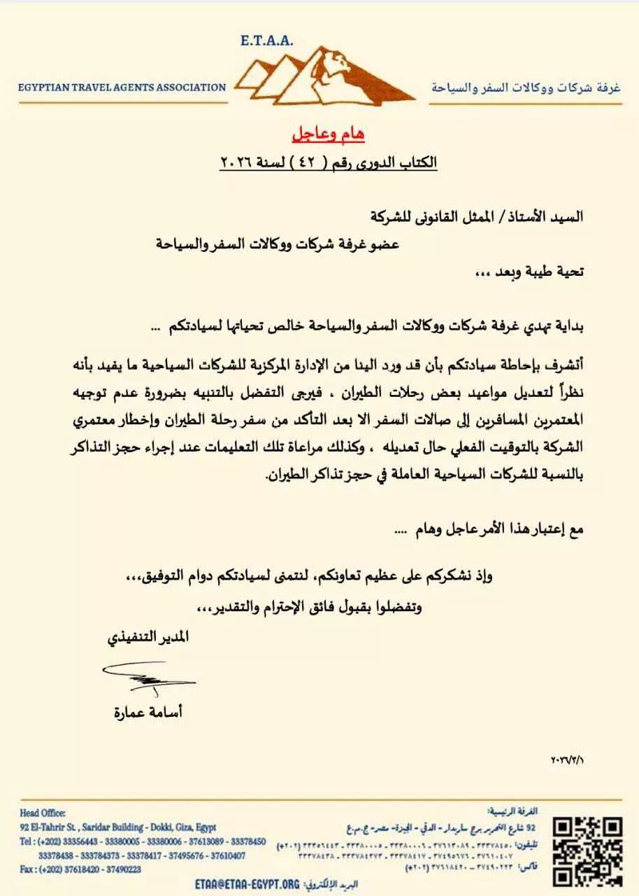 وأكد عضو الاتحاد المصري للغرف السياحية، أن هذه التعليمات تسري أيضًا على الشركات السياحية العاملة في مجال حجز تذاكر الطيران، بما يضمن دقة المواعيد المعلنة للمعتمرين، ويحافظ على انتظام منظومة السفر، مشددًا على أن الهدف من هذه الإجراءات هو التنظيم والاحتياط فقط، وليس نتيجة وجود توقف أو اضطراب في حركة الطيران.